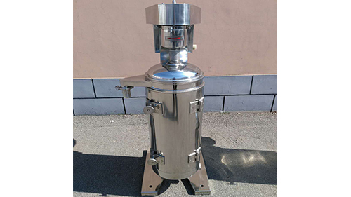 分離機由機身、傳動裝置、轉鼓、集液盤、進液軸承座組成。轉鼓上部是管式離心機的撓性主軸,下部是管式離心機的阻尼浮動軸承,主軸由聯接座及緩沖器與被動輪聯接,電動機通過主動輪、漲緊輪將動力傳送給被動輪、從而使鼓繞自身軸線高速旋轉,形成強大的心理力場。物料由底部進液口射入,離心力迫使料液沿轉鼓內壁向上流動,且因料液不同組分的密度差而分層。